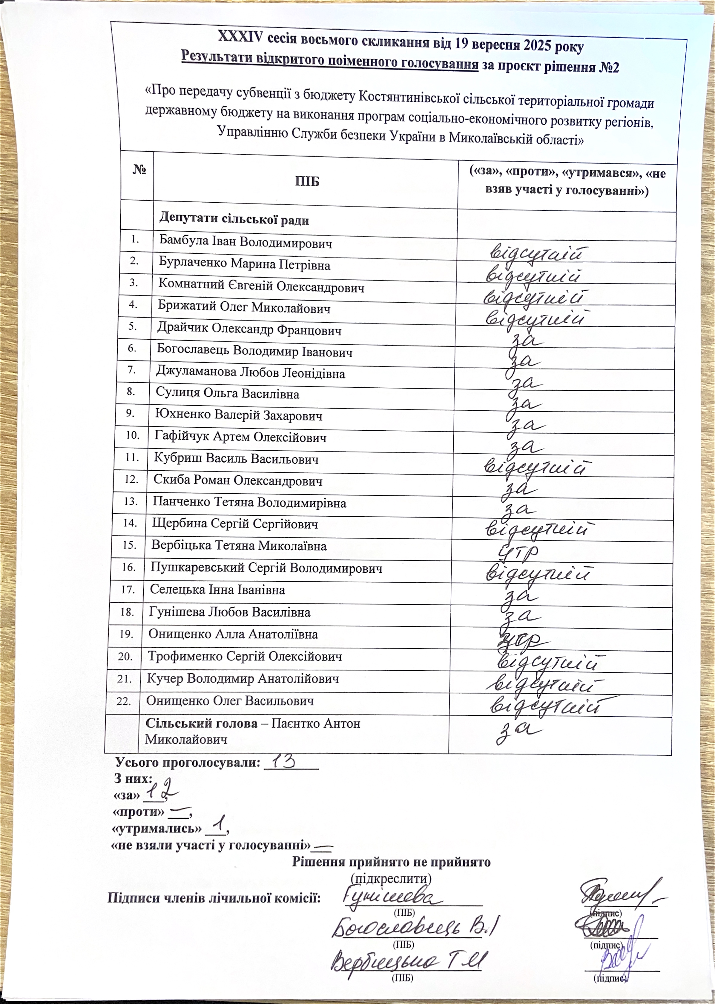 Рішення сільської ради від 19.09.2025 № 2 «Про передачу субвенції з бюджету Костянтинівської сільської територіальної громади державному бюджету на виконання програм соціально-економічного розвитку регіонів, Управлінню Служби безпеки України в Миколаївській області»