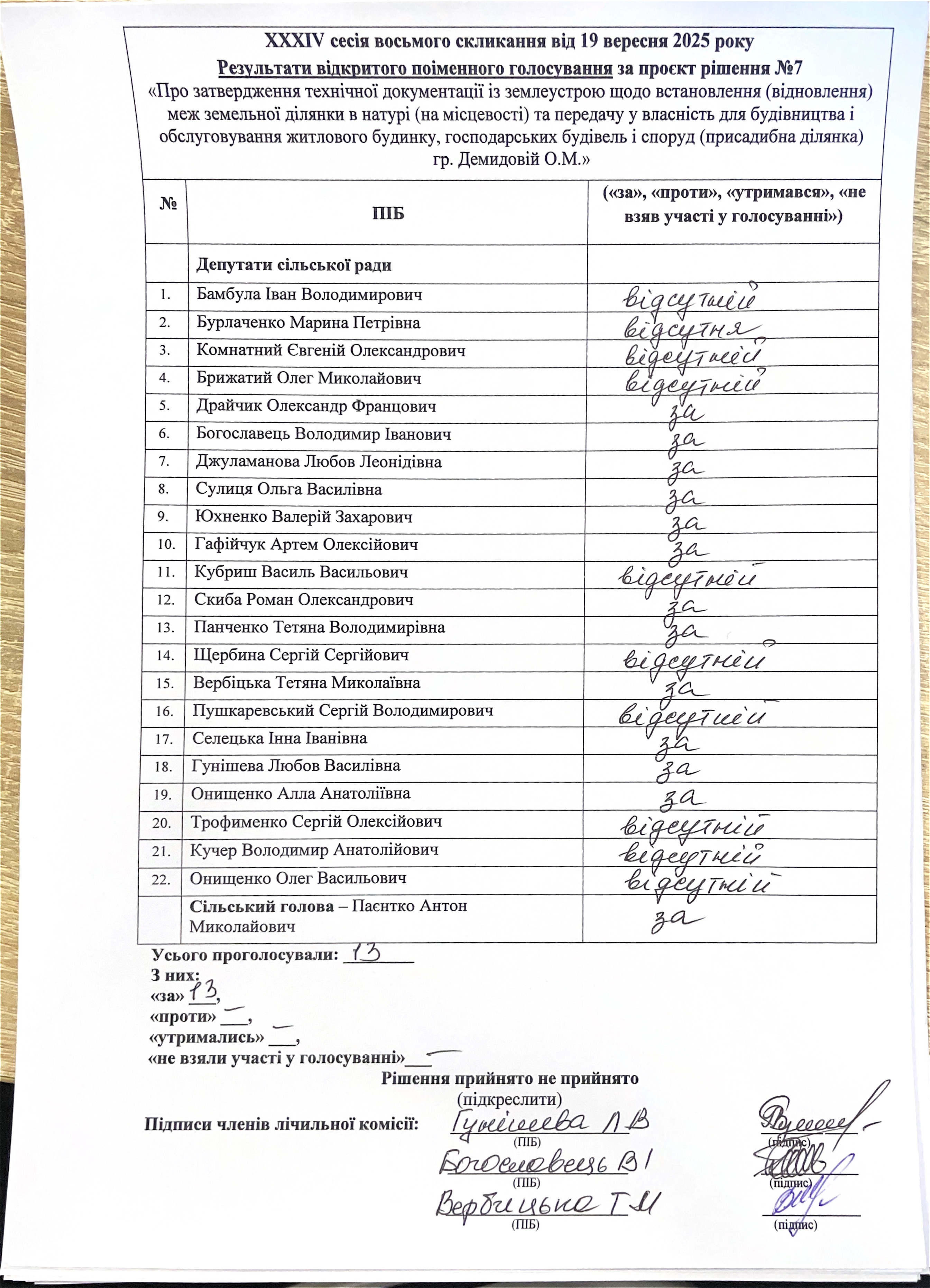 Рішення сільської ради від 19.09.2025 № 7 «Про затвердження технічної документації із землеустрою щодо встановлення (відновлення) меж земельної ділянки в натурі (на місцевості) та передачу у власність для будівництва і обслуговування житлового будинку, господарських будівель і споруд (присадибна ділянка) гр. Демидовій О.М.»