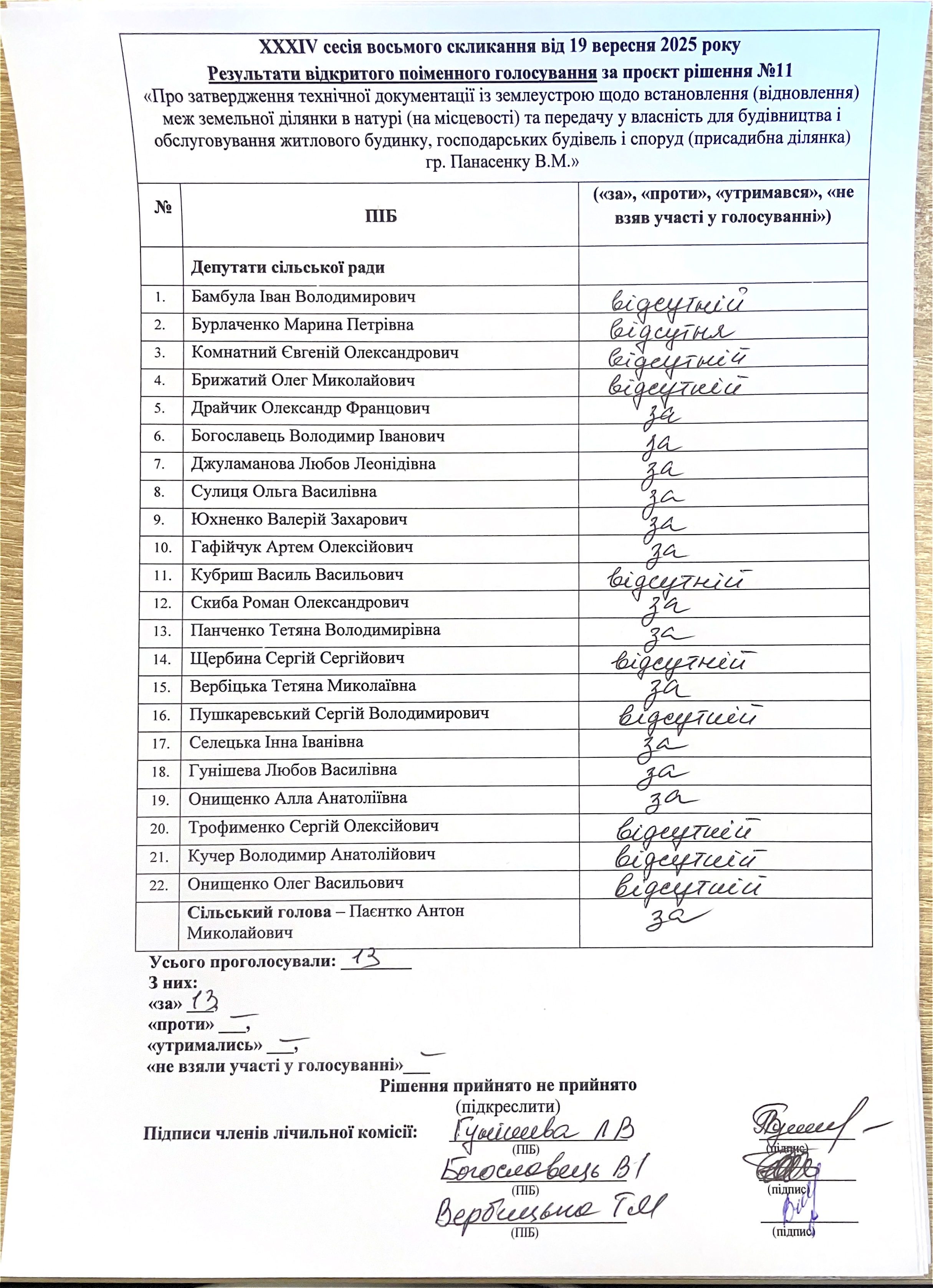 Рішення сільської ради від 19.09.2025 № 11 «Про затвердження технічної документації із землеустрою щодо встановлення (відновлення) меж земельної ділянки в натурі (на місцевості) та передачу у власність для будівництва і обслуговування житлового будинку, господарських будівель і споруд (присадибна ділянка) гр. Панасенку В.М.»