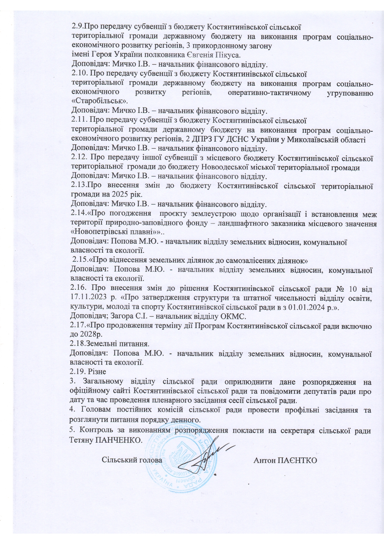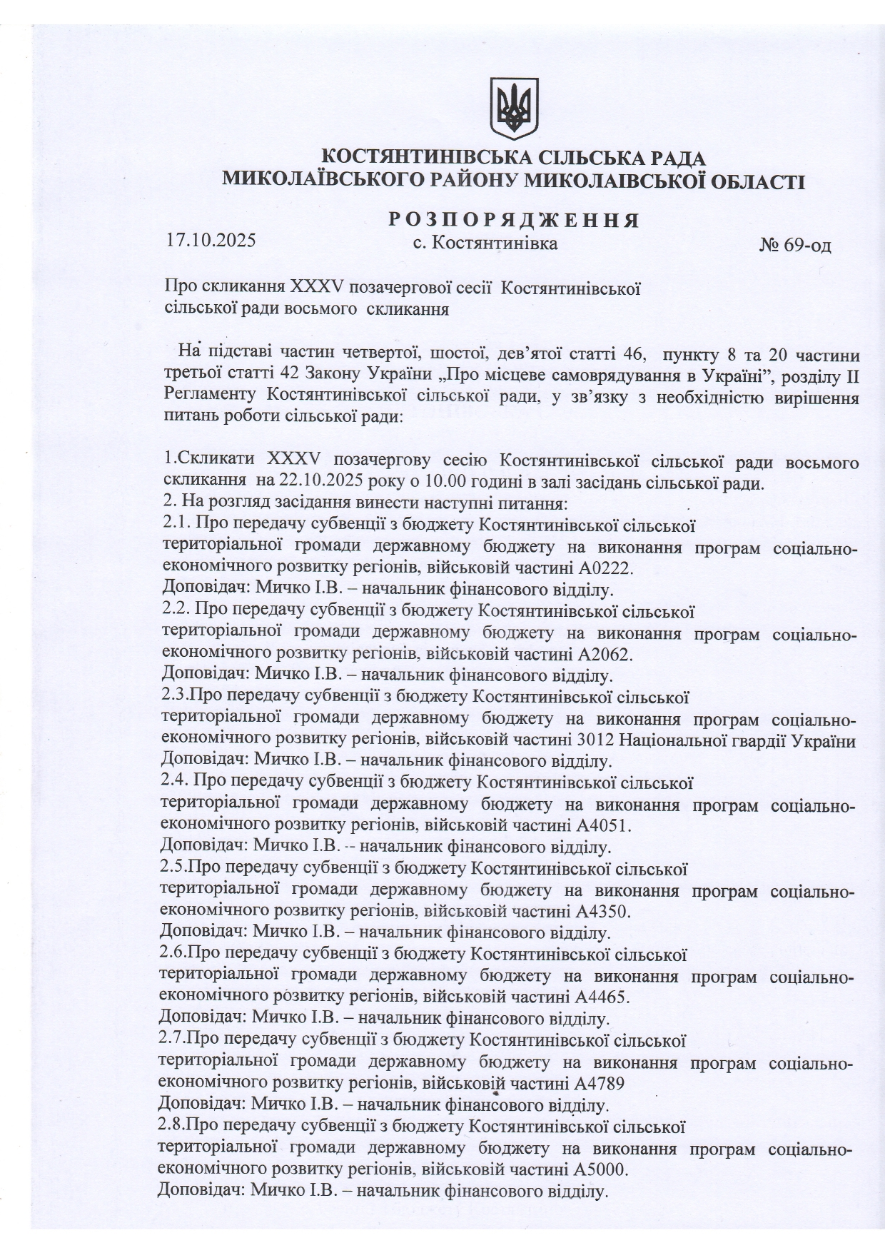 Розпорядження сільського голови від 17.10.2025 № 69-од «Розпорядження про скликання ХХXV позачергової сесії Костянтинівської сільської ради восьмого скликання»