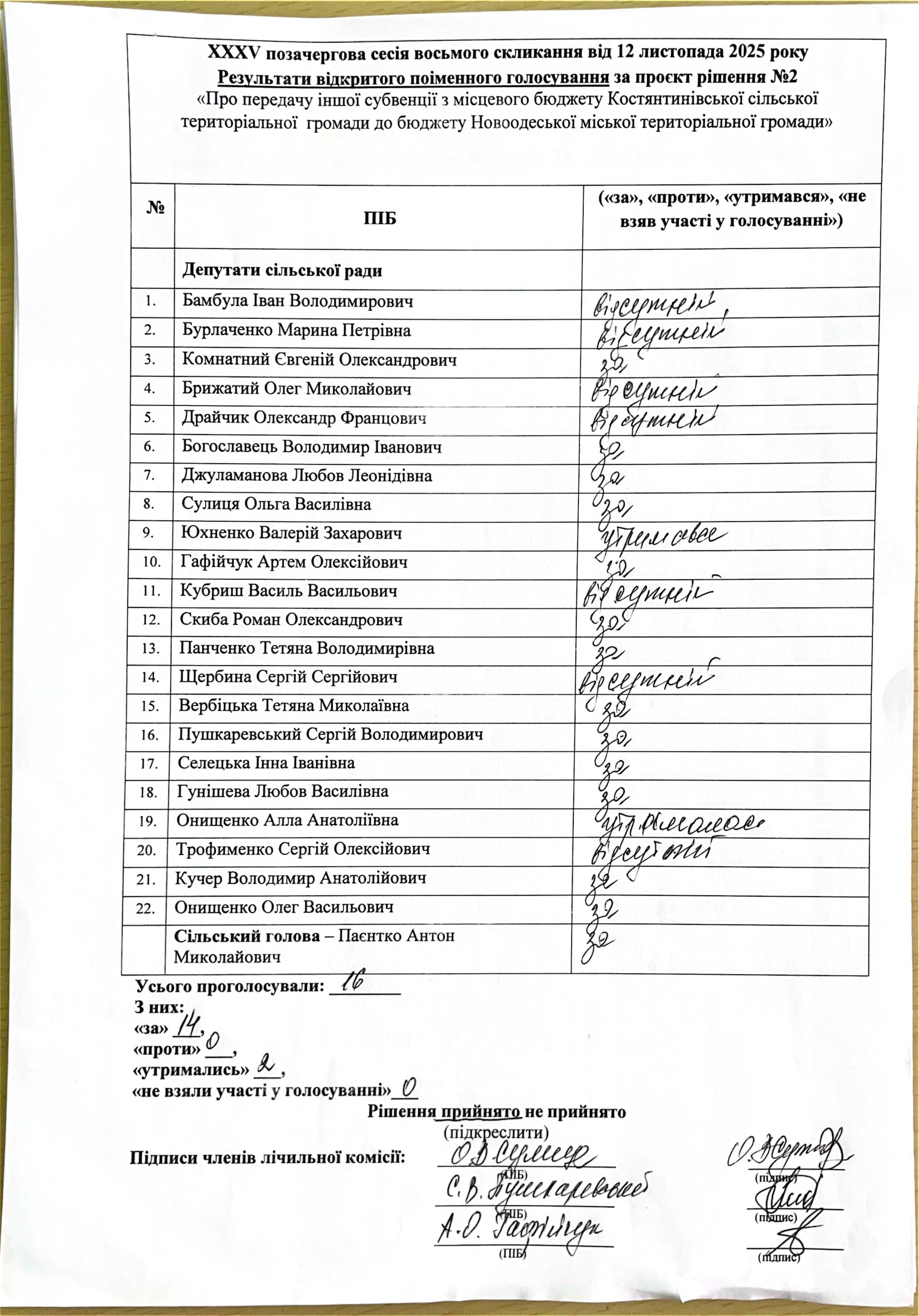 Рішення сільської ради від 12.10.2025 № 2 «Про передачу іншої субвенції з місцевого бюджету Костянтинівської сільської територіальної громади до бюджету Новоодеської міської територіальної громади»
