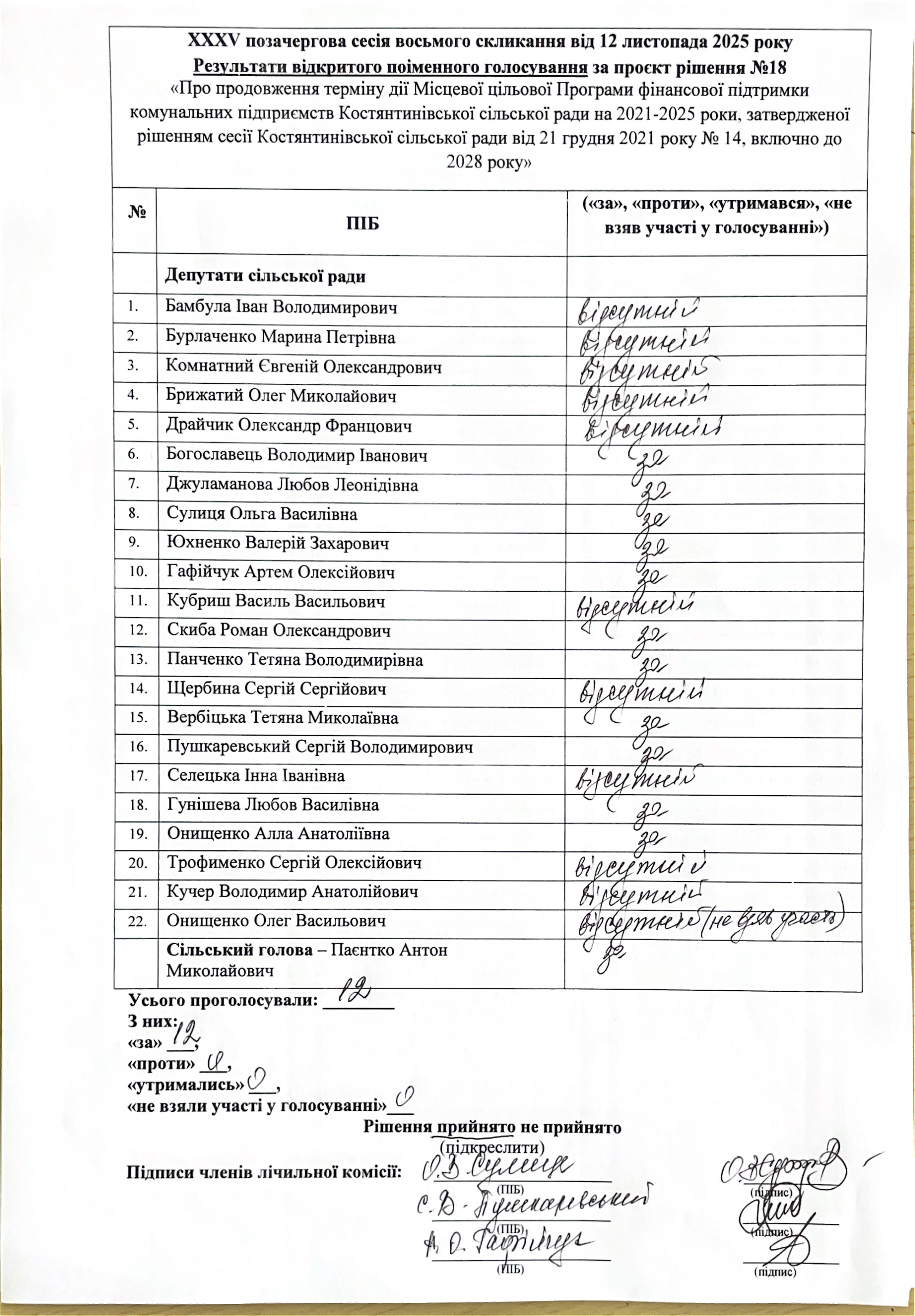 Рішення сільської ради від 12.11.2025 № 18 «Про продовження терміну дії Місцевої цільової Програми фінансової підтримки комунальних підприємств Костянтинівської сільської ради на 2021-2025 роки, затвердженої рішенням сесії Костянтинівської сільської ради від 21 грудня 2021 року № 14, включно до 2028 року»