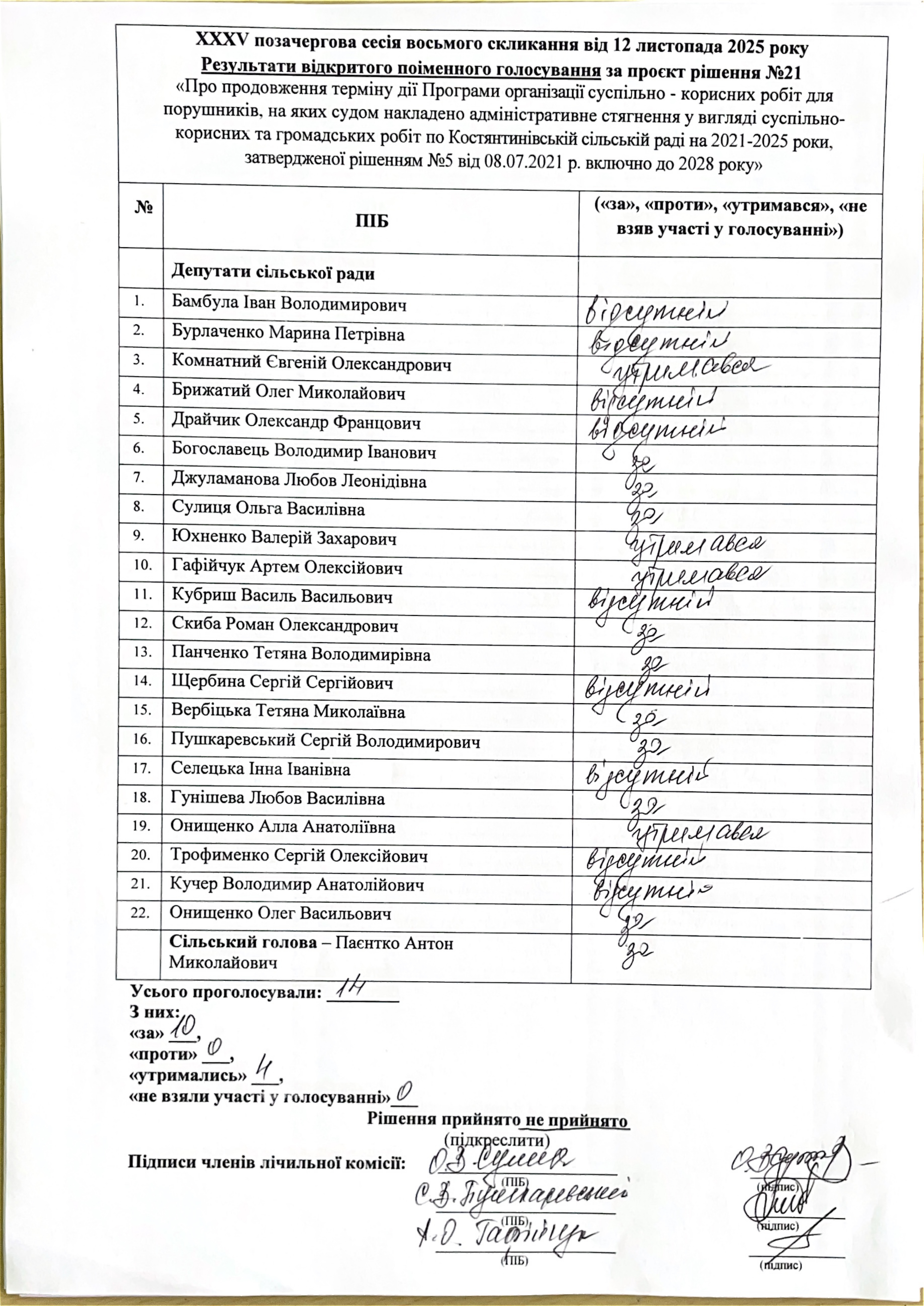Проєкт рішення сільської ради від 12.11.2025 № 21 «Про продовження терміну дії Програми організації суспільно - корисних робіт для порушників, на яких судом накладено адміністративне стягнення у вигляді суспільно-корисних та громадських робіт по Костянтинівській сільській раді на 2021-2025 роки, затвердженої рішенням №5 від 08.07.2021 р. включно до 2028 року»