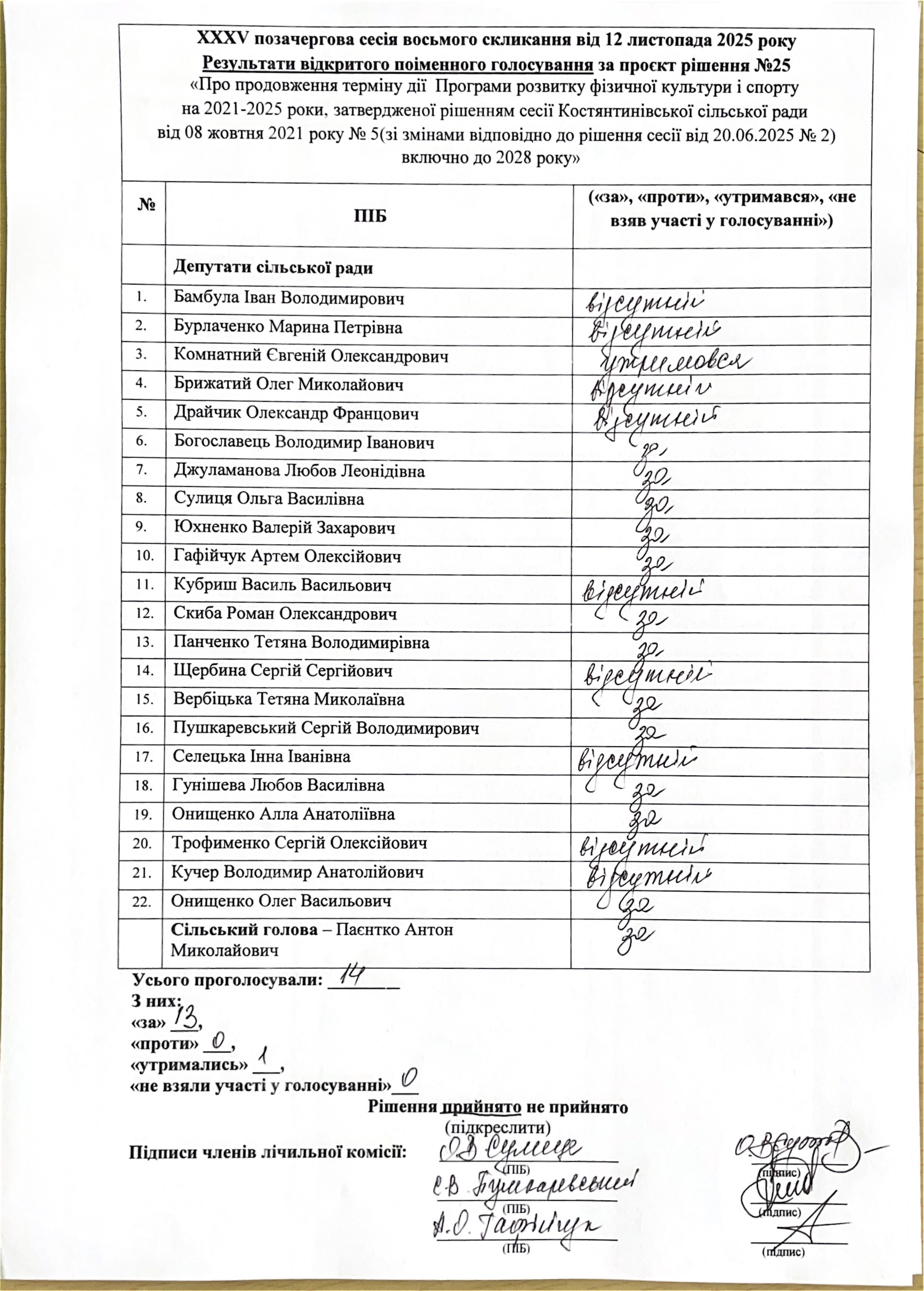 Проєкт рішення сільської ради від 12.11.2025 № 25 «Про продовження терміну дії Програми розвитку фізичної культури і спорту на 2021-2025 роки, затвердженої рішенням сесії Костянтинівської сільської ради від 08 жовтня 2021 року № 5(зі змінами відповідно до рішення сесії від 20.06.2025 № 2) включно до 2028 року»