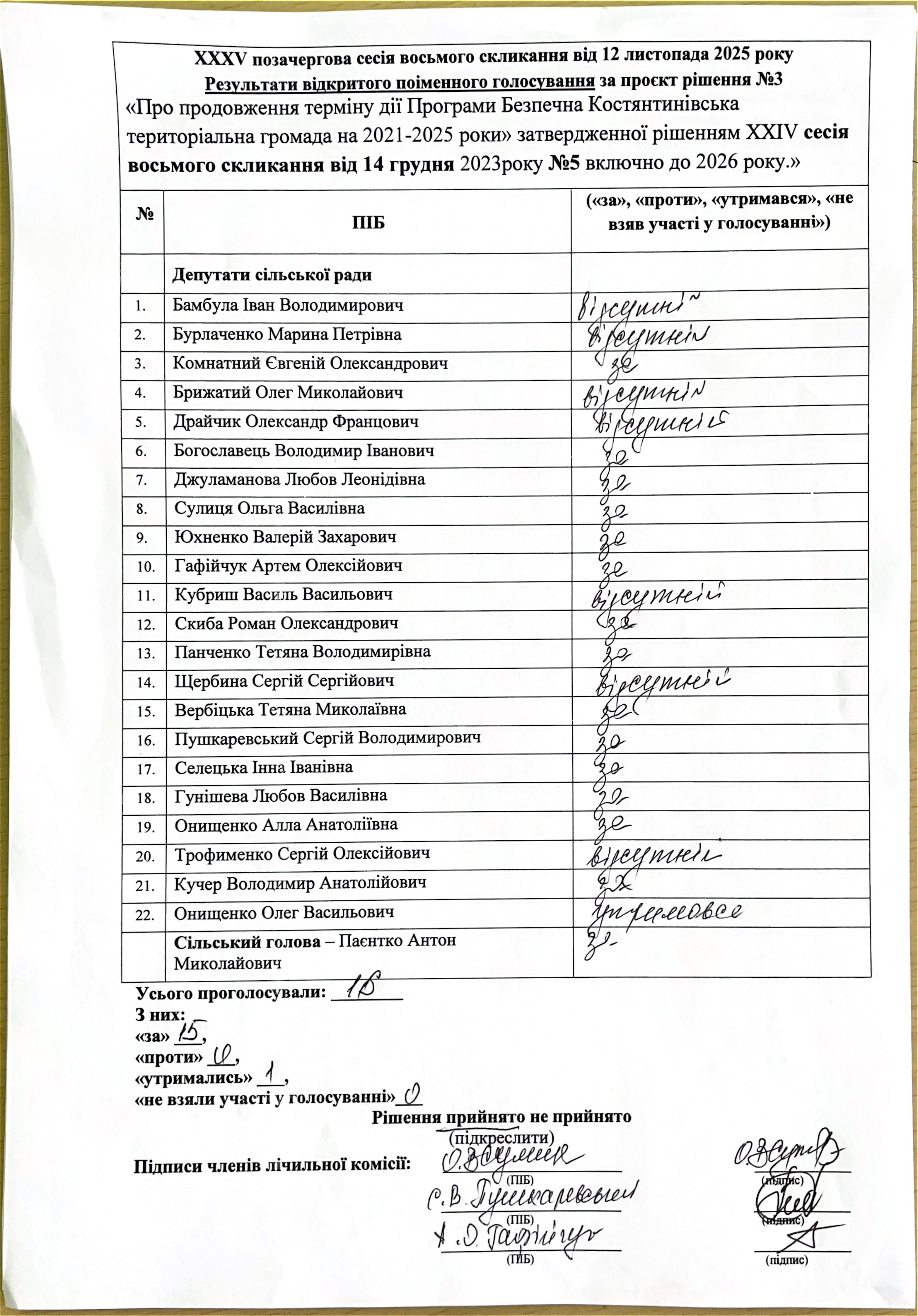 Рішення сільської ради від 12.11.2025 № 3 «Про продовження терміну дії Програми «Безпечна Костянтинівська територіальна громада на 2021-2023 роки» затвердженної рішенням ХХІV сесія восьмого скликання від 14 грудня 2023року №5 включно до 2028року»
