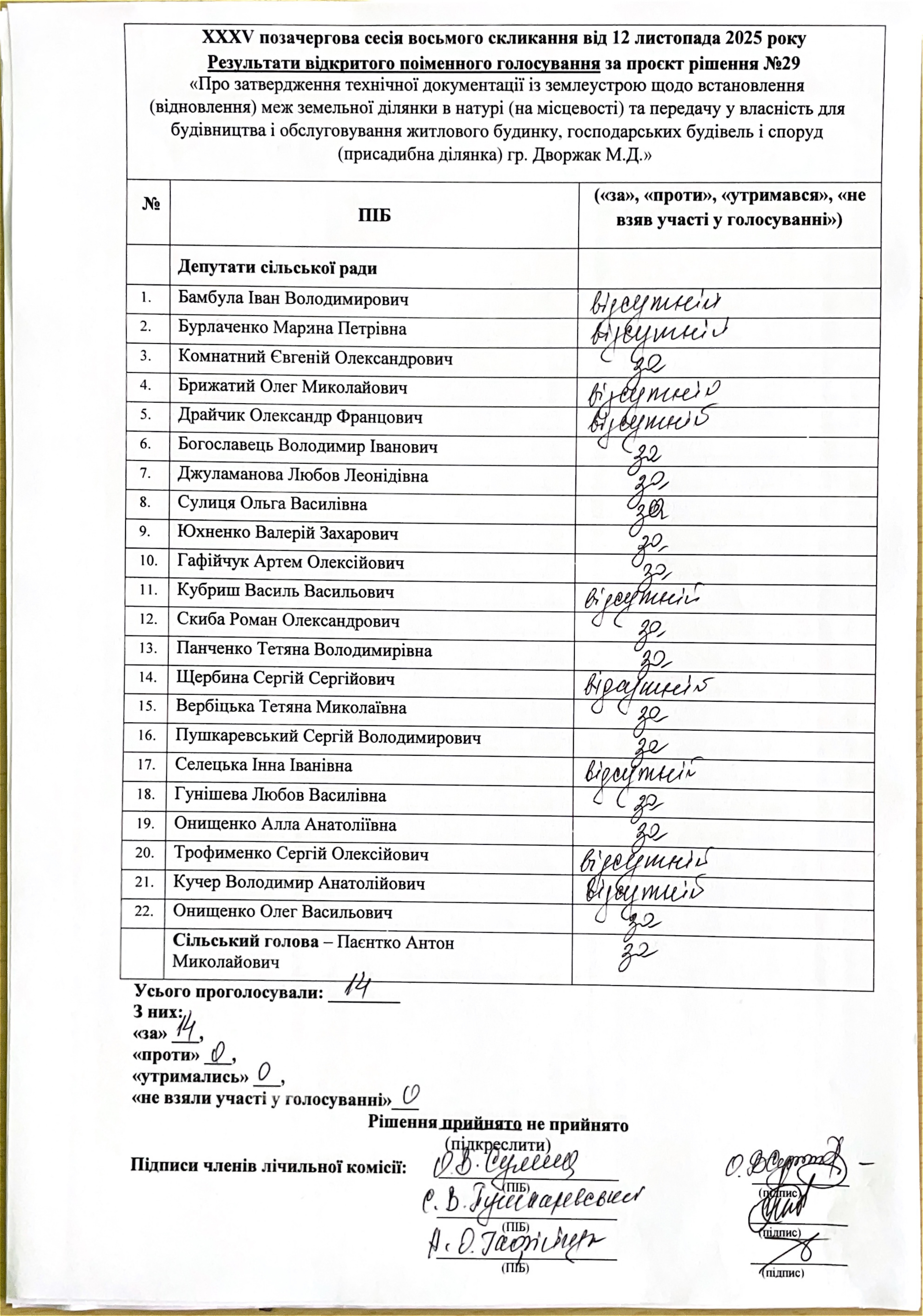Рішення сільської ради від 12.11.2025 № 29 «Про затвердження технічної документації із землеустрою щодо встановлення (відновлення) меж земельної ділянки в натурі (на місцевості) та передачу у власність для будівництва і обслуговування житлового будинку, господарських будівель і споруд (присадибна ділянка) гр. Дворжак М.Д.»