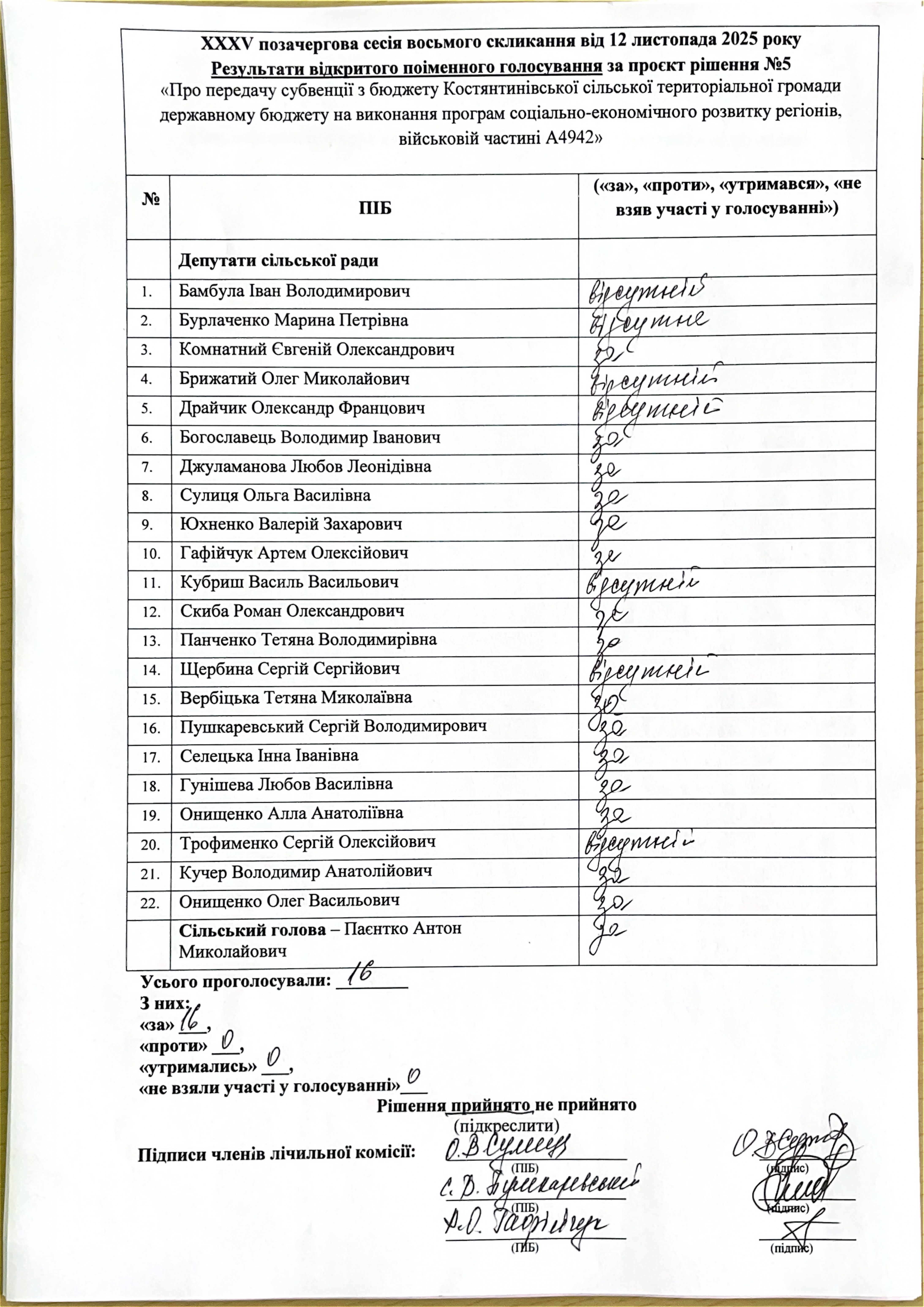 Рішення сільської ради від 12.11.2025 № 5 «Про передачу субвенції з бюджету Костянтинівської сільської територіальної громади державному бюджету на виконання програм соціально-економічного розвитку регіонів, військовій частині А4942»