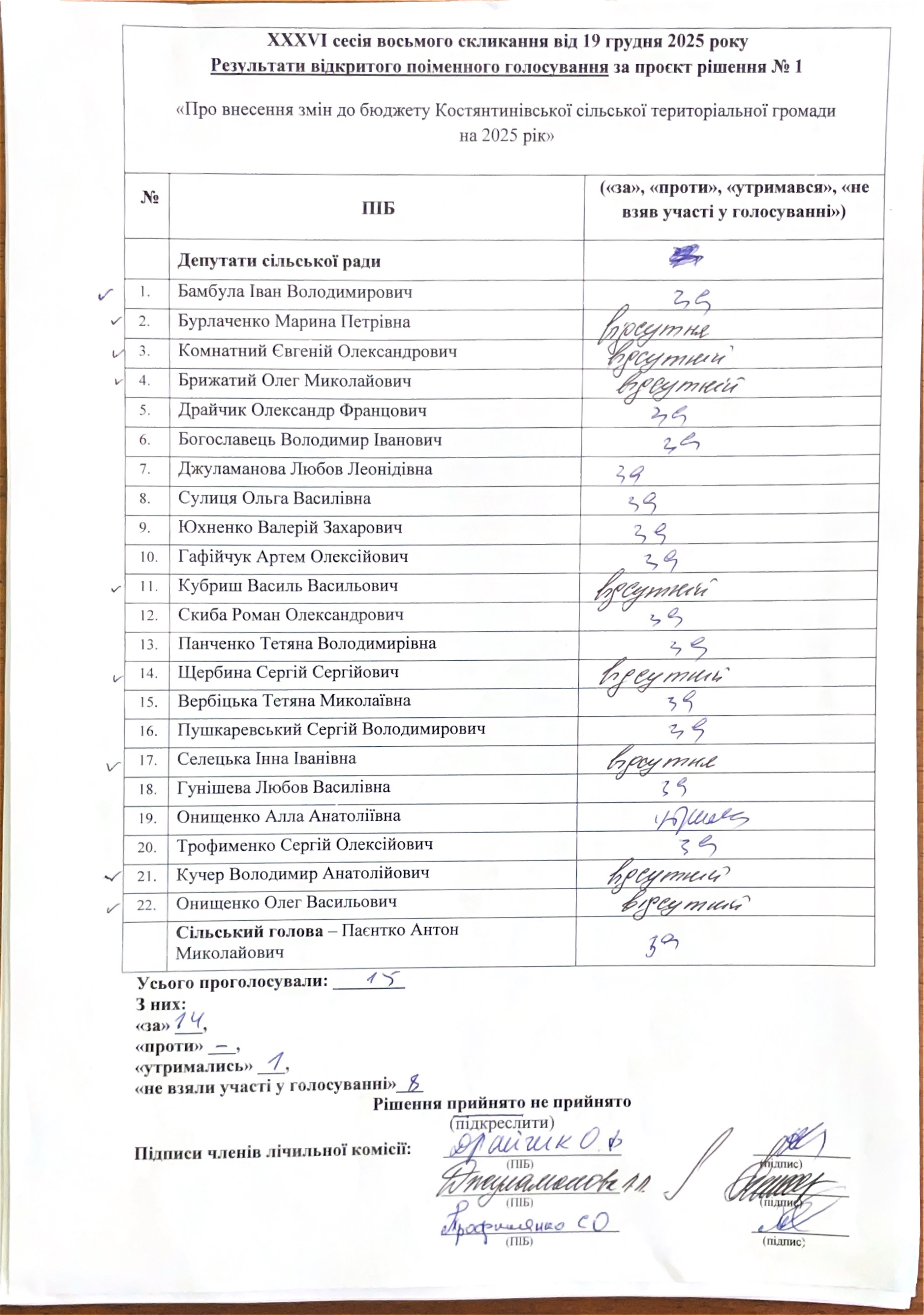 Рішення сільської ради від 19.12.2025 № 1 «Про внесення змін до бюджету Костянтинівської сільської територіальної громади на 2025 рік (1454700000) код бюджету»