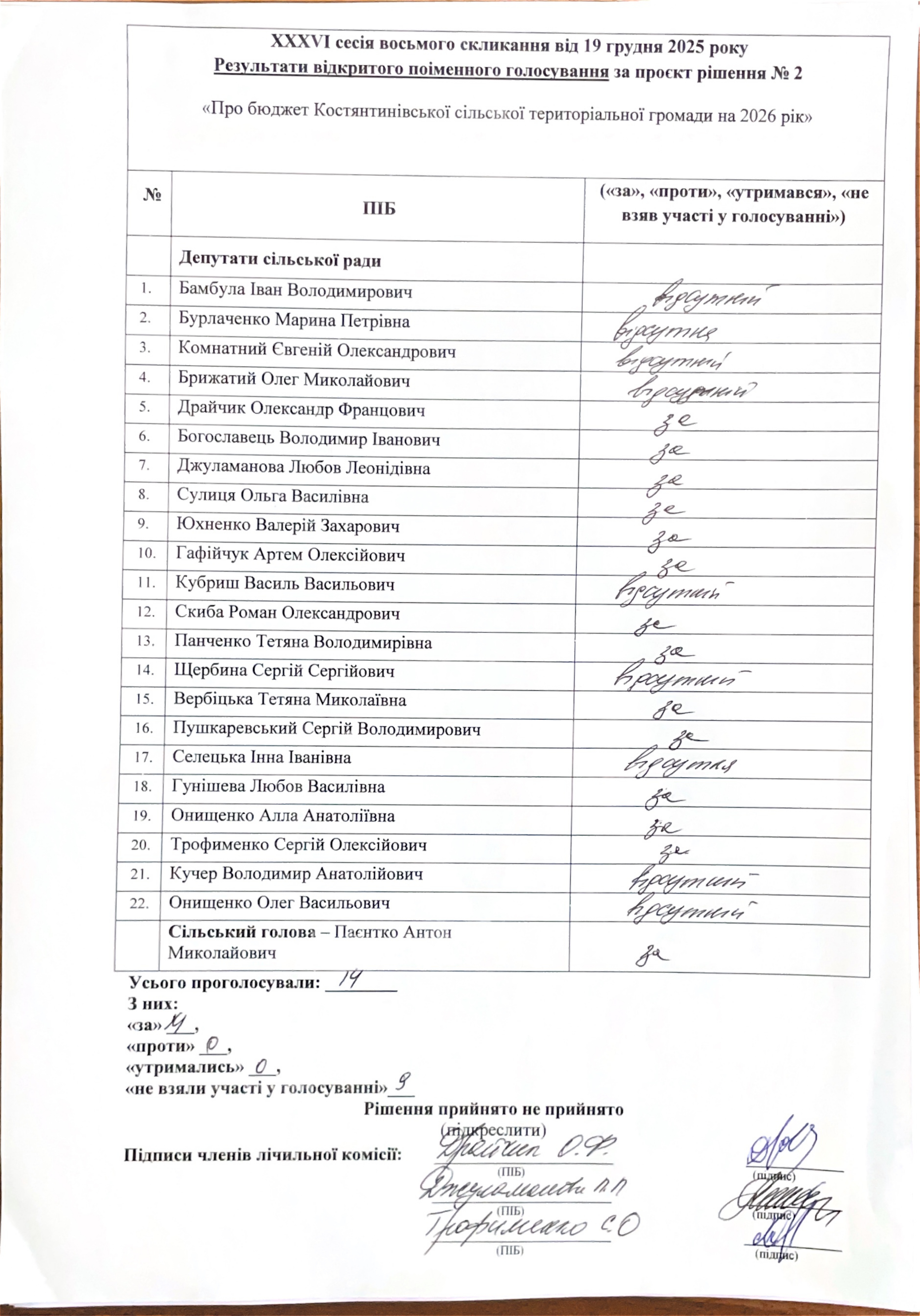 Рішення сільської ради від 19.12.2025 № 2 «Про бюджет Костянтинівської сільської територіальної громади на 2026 рік»