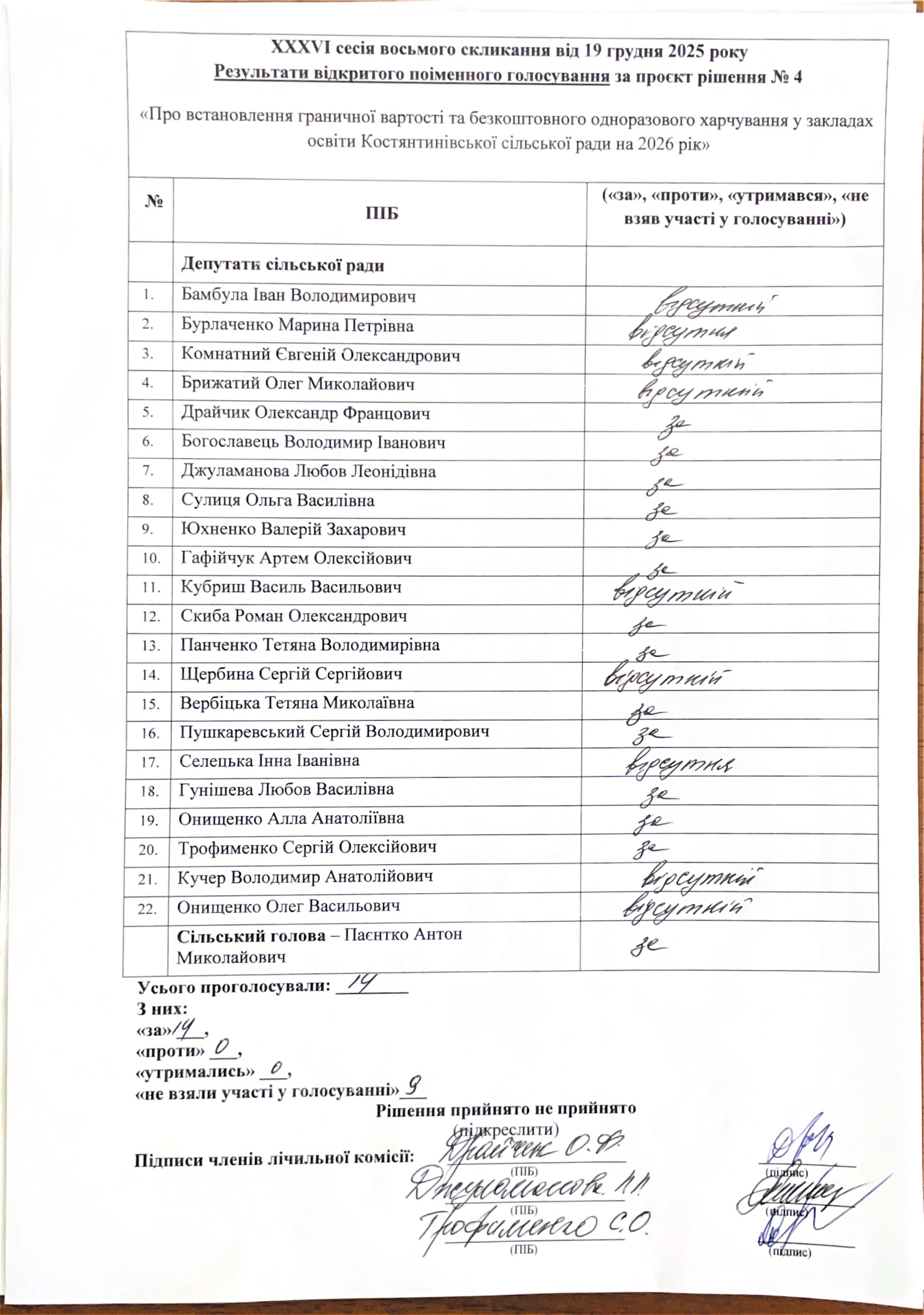 Рішення сільської ради від 19.12.2025 № 4 «Про встановлення граничної вартості та безкоштовного одноразового харчування у закладах освіти Костянтинівської сільської ради на 2026 рік»
