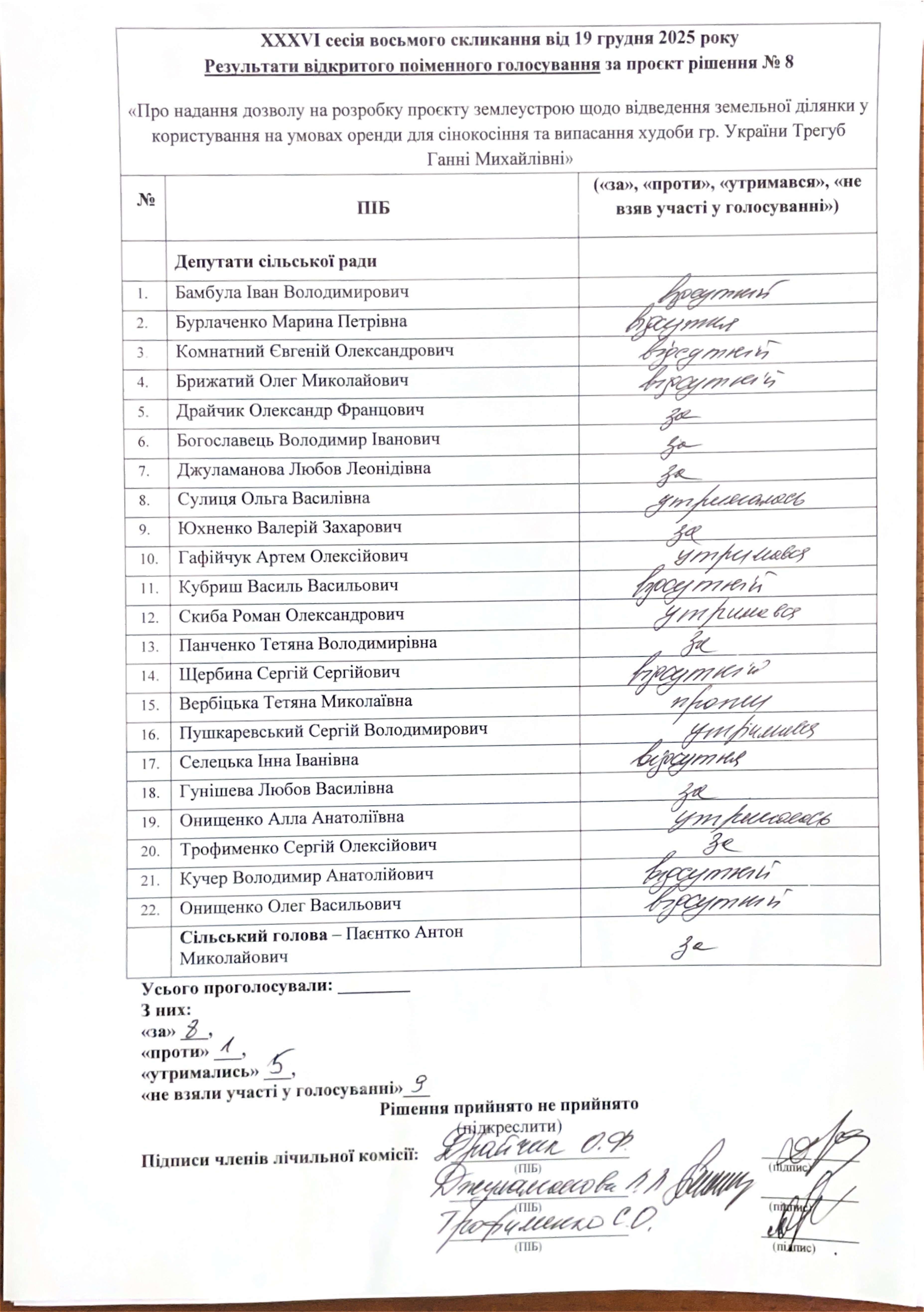 Проєкт рішення сільської ради від 19.12.2025 № 8 «Про надання дозволу на розробку проєкту землеустрою щодо відведення земельної ділянки у користування на умовах оренди для сінокосіння та випасання худоби гр. України Трегуб Ганні Михайлівні»