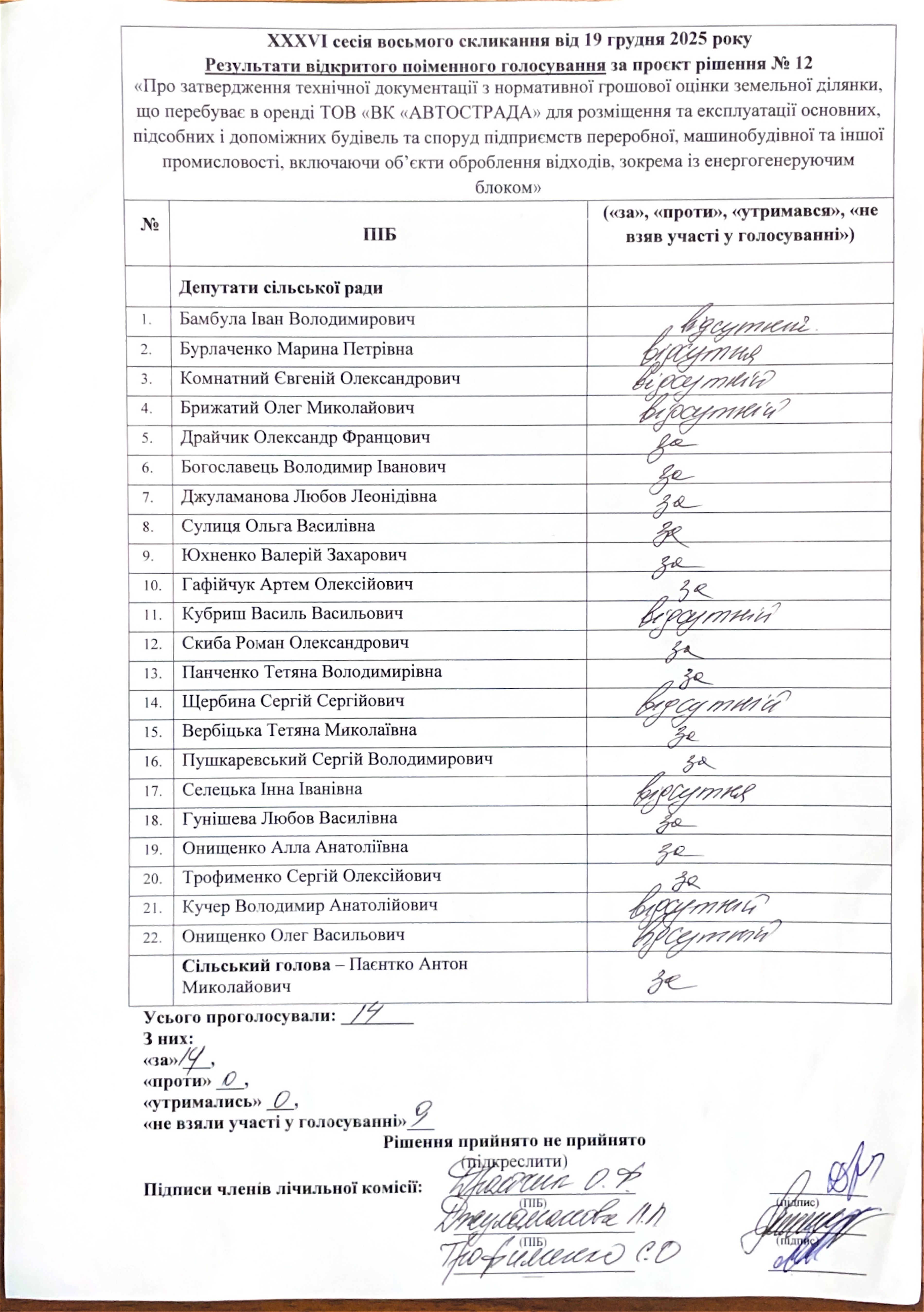 Рішення сільської ради від 19.12.2025 № 12 «Про затвердження технічної документації з нормативної грошової оцінки земельної ділянки, що перебуває в оренді ТОВ «ВК «АВТОСТРАДА» для розміщення та експлуатації основних, підсобних і допоміжних будівель та споруд підприємств переробної, машинобудівної та іншої промисловості, включаючи об’єкти оброблення відходів, зокрема із енергогенеруючим блоком»